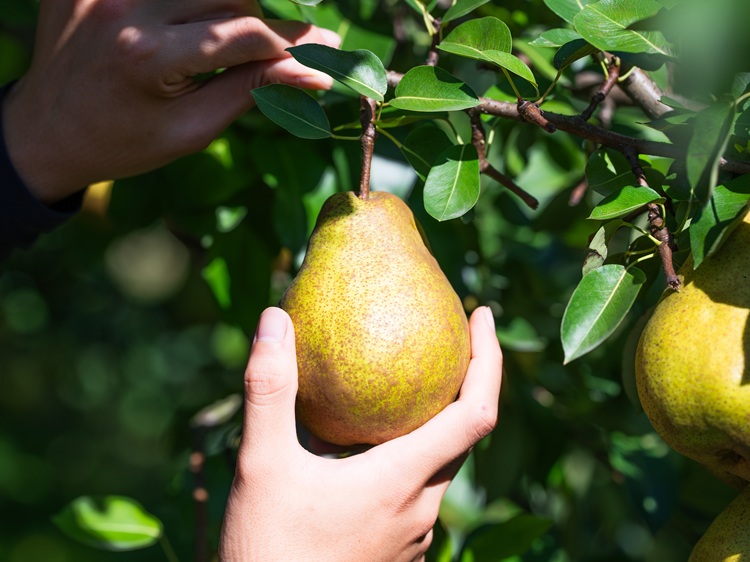 ラフランスは他の果物と違い樹上で食べ頃にはなりません。 食べ頃である完熟まで樹上に置くと傷みが発生してしまうため収穫適期に硬い状態で収穫作業を行います。
