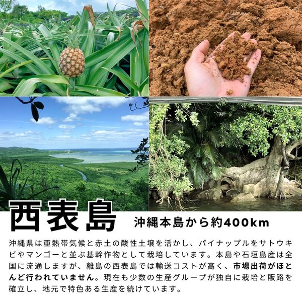 ピーチパインは、桃のような甘い香りとジューシーな果肉が特徴で、芯まで食べられるのが魅力です。1玉あたり600g~800gほどの小ぶりなサイズで、果肉は乳白色で柔らかく、濃厚な甘さとほど良い酸味が楽しめます。芯まで食べられる品種として、『西表島フルーツ』の創業者の川満洋一さんが開発し、長年愛情を込めて育て続けています。世界自然遺産の島『西表島』産のピーチパインは生産量が少なく、国内流通するパイン全体でわずか『1%』のまさに”幻のパイナップル”です!
