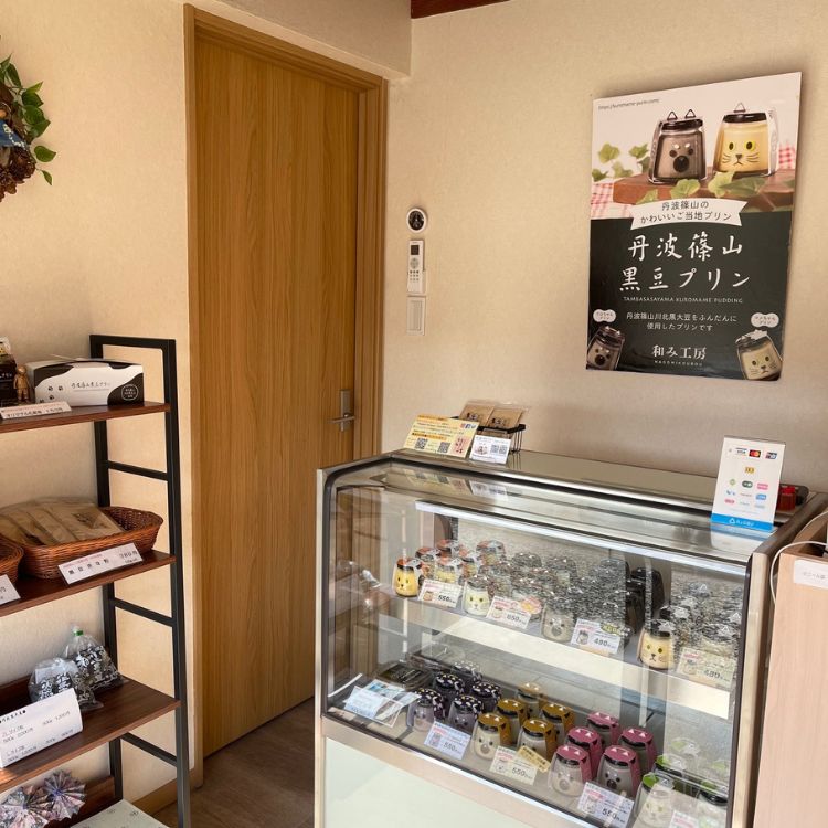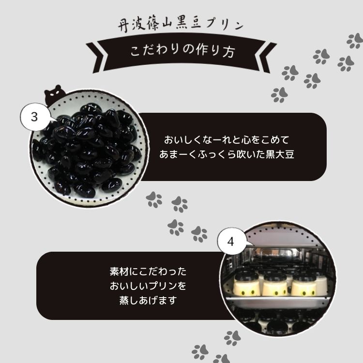 カスタードプリンの「マメちゃん」と、黒豆豆乳で仕上げた「クロちゃん」には全て自社農園で栽培した丹波篠山川北黒大豆を使用。