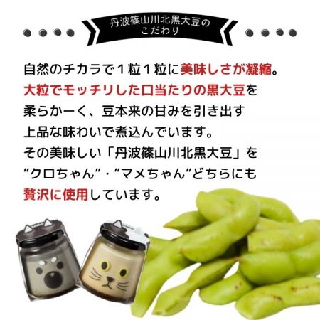 | 白いマメちゃんプリンは牛乳のカスタードプリンにゃー!これこそプリンというみんなが大好きな味だにゃー!丹波黒の煮豆ととっても相性がいいんだにゃー!黒大豆の食感と美味しさがベストマッチにゃー! |