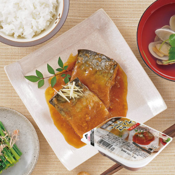 国産さばを骨まで柔らかく、ふっくらとした味噌煮に仕上げました。生姜の風味がアクセントになっています。