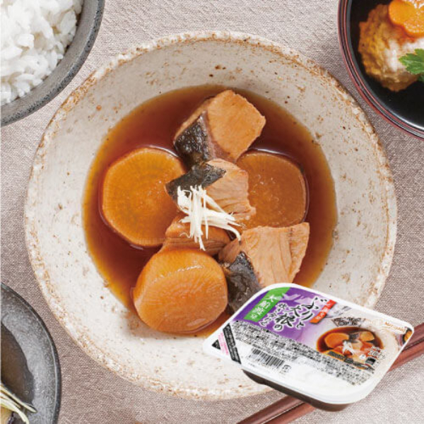 ぶり(国産)、大根、煮魚たれ(砂糖、しょうゆ、果糖ぶどう糖液糖、生姜、その他)、 砂糖、醸造酢、風味調味料、コショウ/トレハロース、調味料(アミノ酸等)、酒精、増粘剤(加工でん粉、キサンタン)、 カラメル色素、(一部に小麦・さば・大豆を含む)