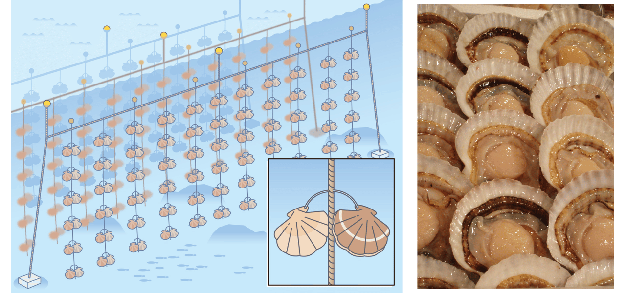 ホタテガイは北海道や青森県が一大産地になっており、垂下(すいか)式と地撒き(じまき)式という二通りの生産方法があります。どちらも自然の餌を食べて育つので環境に優しく持続可能な方法で生産されているのが特徴。
